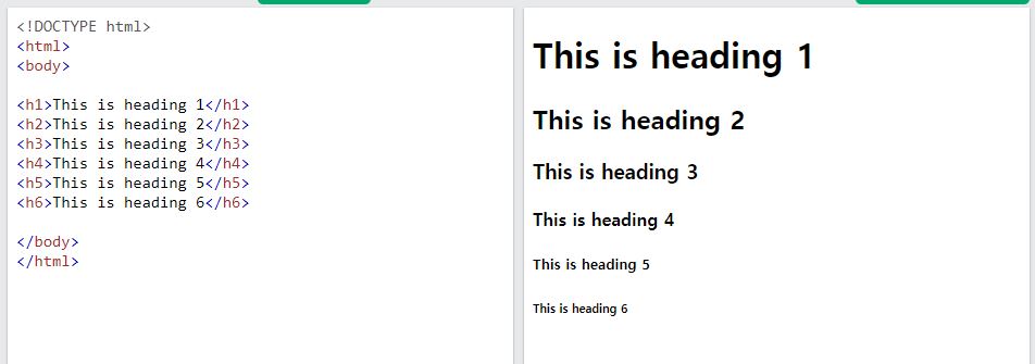 HTML은 제목 글씨를 쓸땐 꼭 <h1>~<h6>태그를 쓰는데요. 해당 태그는 중요한 제목이나 헤드라인을 쓸때 사용됩니다. <h1>~<h6>처럼 뒷 숫자가 커질수록 글씨의 크기는 줄어듭니다.